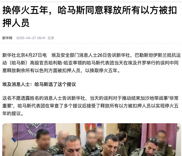 我看了一下,这是哈马斯单方面向国际社会抛出停火新方案。该组织高级官员哈利勒·哈亚通过法新社表示,愿意一次性释放所有剩余被扣押人员,并接受五年停火协议,但前提是以军必须全面撤出加沙地带。这一提议与以色列政府的加沙完全“去军事化”要求存在根本分歧。以色列总理内塔尼亚胡在当天的内阁会议上强硬表态:“哈马斯若不释放24名存活人质,以军将扩大地面攻势。”以军总参谋长扎米尔更威胁称,加沙将迎来“更猛烈轰炸”。